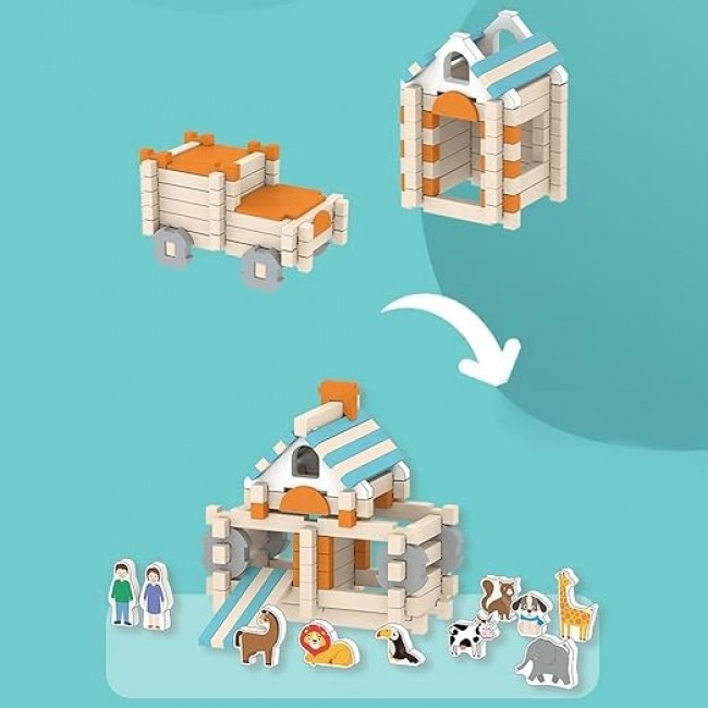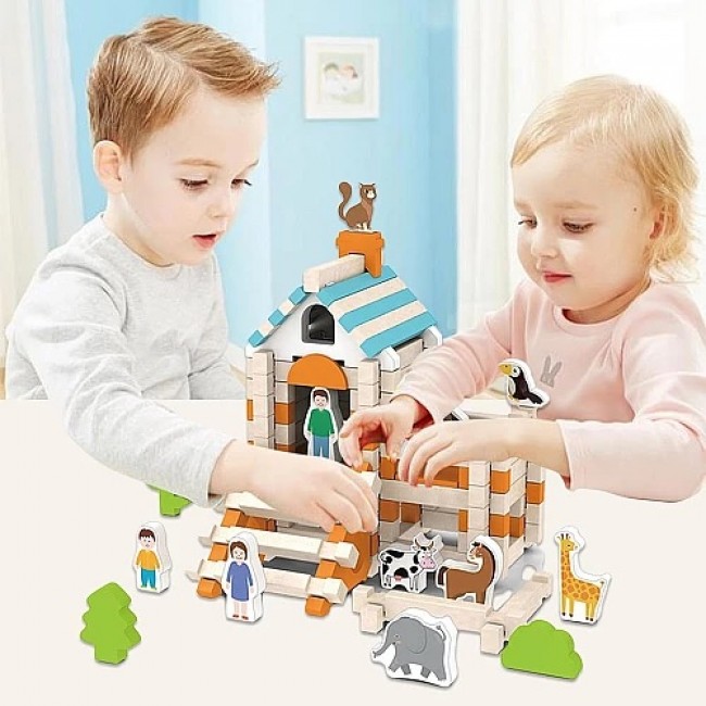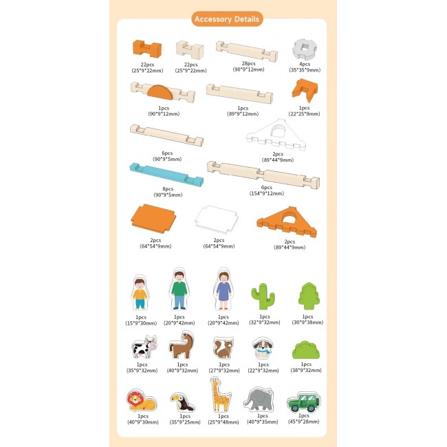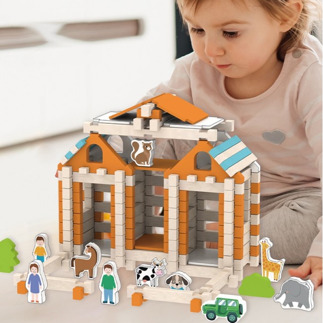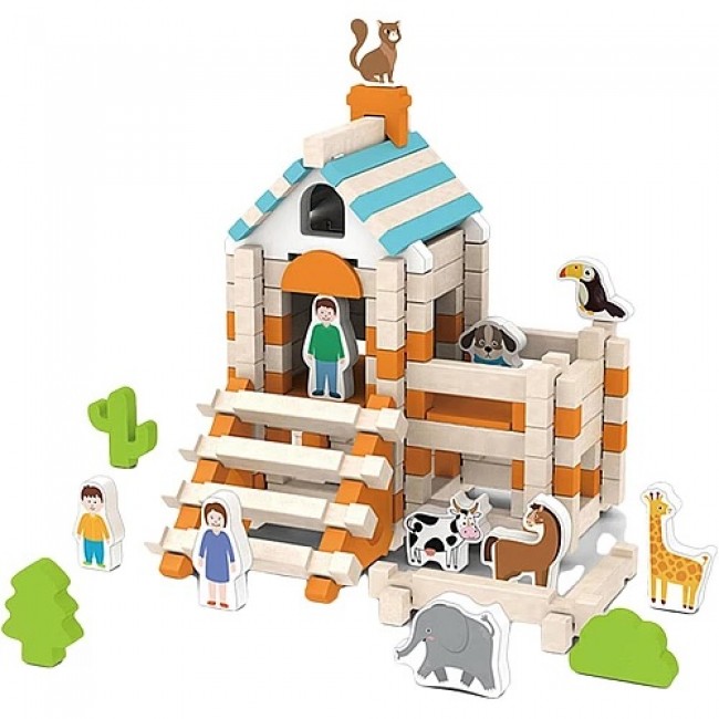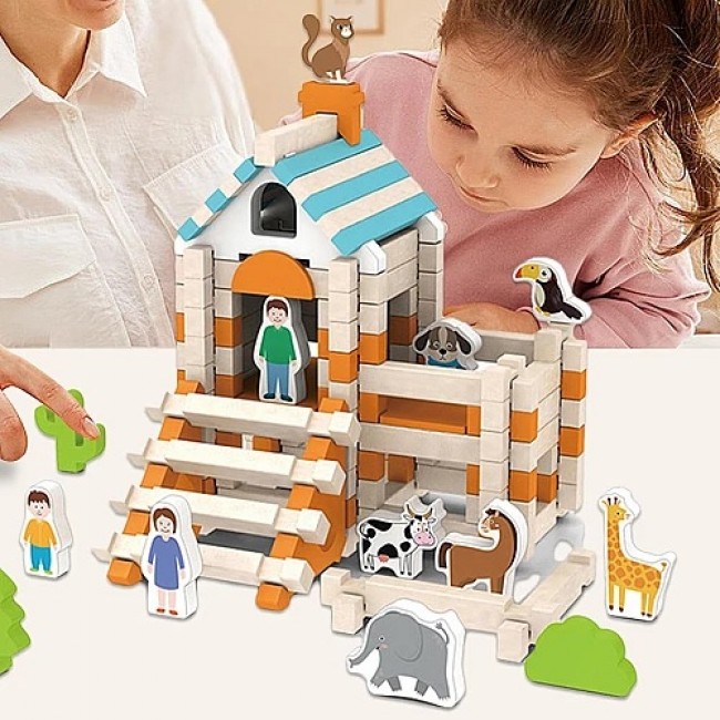 Набір складається з 107 деталей та 15 фігурок тварин, людей і дерев, що робить гру ще більш реалістичною та цікавою. Завдяки екологічним матеріалам та приємним на дотик дерев’яним блокам дитина із задоволенням буде будувати, фантазувати і розвивати свої творчі здібності.