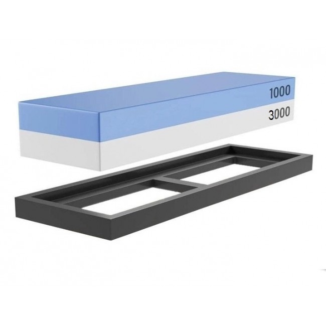 Двосторонній точильний водний камінь Водний точильний камінь 1000/3000 grit з гумовою рамкою-підставкою, що запобігає його ковзанню в процесі заточування. Призначений для заточування ножів різного та типу та призначення, а також інших різальних інструментів для кухні та побуту.