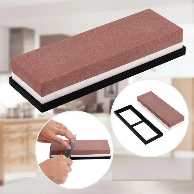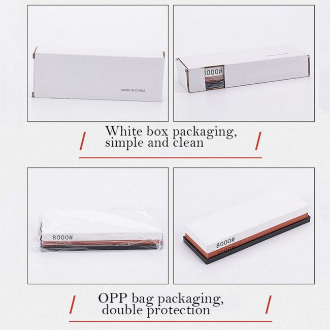 Сторона з розміром зерна 3000 грит підходить для формування ріжучої кромки ножів з твердих сталей (наприклад, традиційних японських кухонних ножів) або фінішної доведенні клинків звичайної твердості. Сторона, що має зернистість 8000 грит призначена для полірування ріжучої кромки. Укомплектований підкладкою з гуми рамкового типу, яка запобігає його ковзання при роботі.