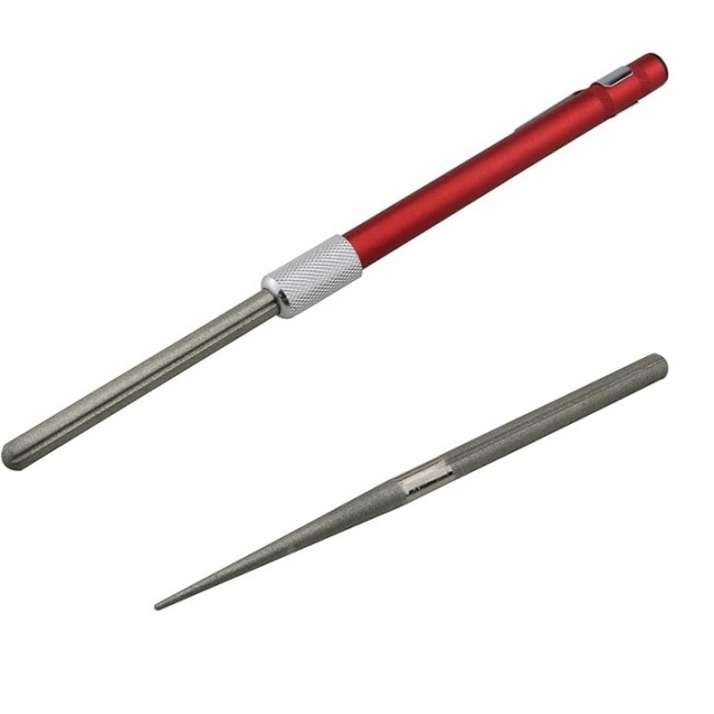 Карманна точилка може бути використана Вами для різних цілей. З одного боку мусата знаходиться плоска поверхня для заточування ножів, який відмінно підійде для правки і наведення режучої крони. З іншого боку мусат має конусоподібну форму і знадобиться вам для заточки Серрейторів і пил. Крім того, на алмазному стержні є виємка, яка дозволить вам ефективно точити рибальські гачки.