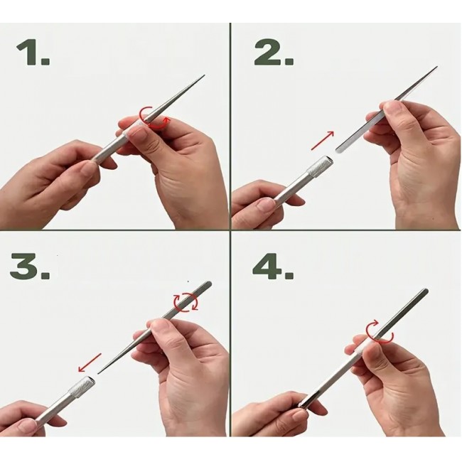 Карманна точилка може бути використана Вами для різних цілей. З одного боку мусата знаходиться плоска поверхня для заточування ножів, який відмінно підійде для правки і наведення режучої крони. З іншого боку мусат має конусоподібну форму і знадобиться вам для заточки Серрейторів і пил. Крім того, на алмазному стержні є виємка, яка дозволить вам ефективно точити рибальські гачки.