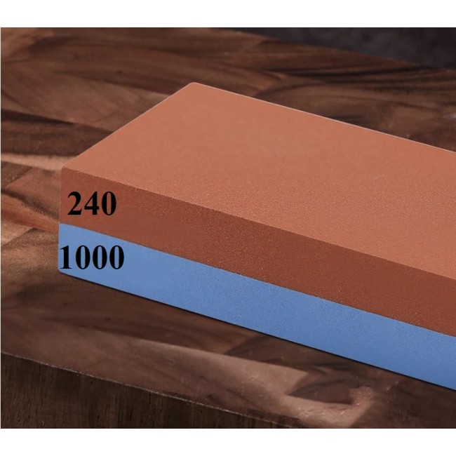 Двосторонній точильний водний камінь Водний точильний камінь 240/1000 grit з гумовою рамкою-підставкою, що запобігає його ковзанню в процесі заточування. Призначений для заточування ножів різного та типу та призначення, а також інших різальних інструментів для кухні та побуту.