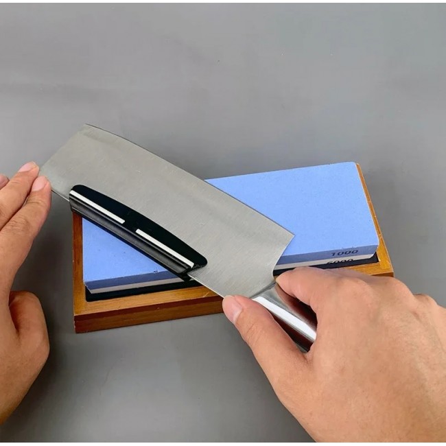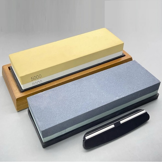 Камінь точильний для ножів має гумову основу, яка запобігає ковзанню. Він має насадку, що дозволяє зберегти потрібний кут під час процесу заточування. Камінь має два рівні зернистості – 3000 та 6000. Це дає можливість зробити лезо ножа ще більш гострим (дзеркальним) за допомогою застосування двох сторін по черзі.