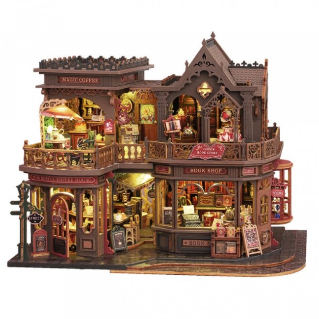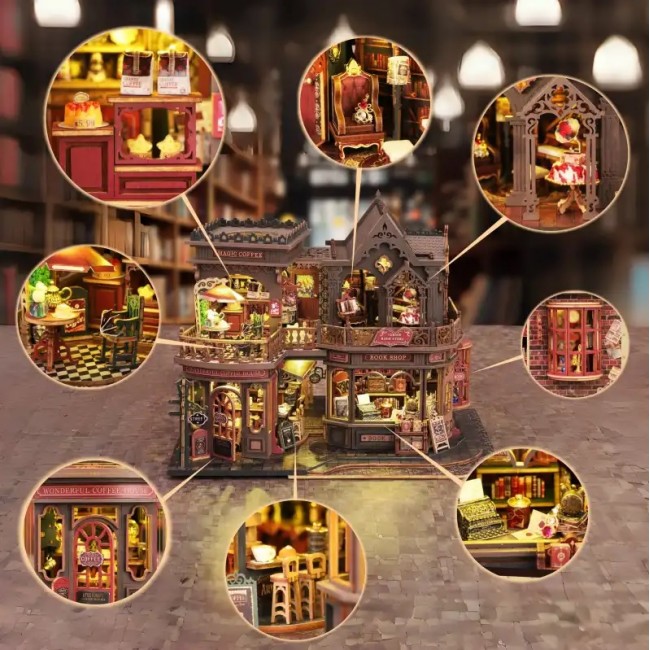 Цей набір вражає деталізацією: тераса з кавою, вітрини з книгами, декоративні вивіски, сходи, меблі та тепле підсвічування створюють ефект справжнього європейського містечка. Дворівнева конструкція додає об’єму та виглядає дуже "живою" в інтер’єрі.